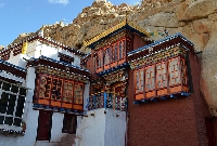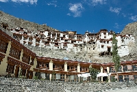 The annual celebrations held on the 9th and 10th day of the sixth month of the Tibetan calendar at Takthok Monastery of Leh Ladakh include sacred dances and the rituals of consecrated offering. To the left of the central courtyard is the cave chapel of the monastery.